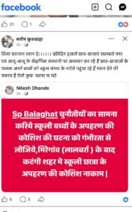 बता दें बालाघाट में यह पहली घटना नहीं है। इससे पहले भी इसी क्षेत्र के मिरगांव में भी दिनदहाड़े चौथी कक्षा की छात्रा को बाइक पर बैठाकर ले जाने की कोशिश की गई थी। बच्ची के साहस से वह बच निकली। दोनों घटनाओं के बाद लोग पूछ रहे हैं- क्या यह महज संयोग है या किसी गिरोह की सक्रियता?