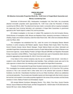 नई दिल्ली। फर्जी बैंक गारंटी के जरिए सरकारी एजेंसियों से भारी रकम निकालने के मामले में बड़ा खुलासा हुआ है। प्रवर्तन निदेशालय (ED) ने तीर्थ गोपिकॉन लिमिटेड (TGL) और उसके प्रमोटर्स से जुड़ी करीब 10.80 करोड़ रुपये की अचल संपत्तियां कुर्क की हैं। यह कार्रवाई धन शोधन निवारण अधिनियम (PMLA) के तहत की गई है।
