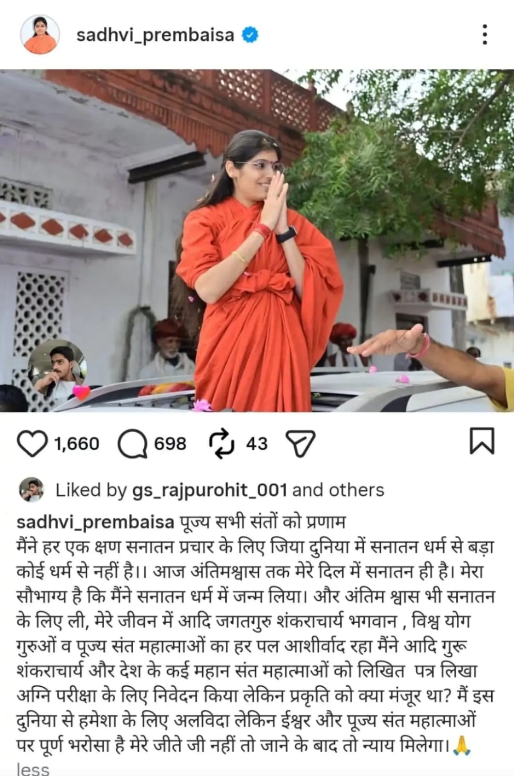 साध्वी के इंस्टाग्राम अकाउंट से पोस्ट किया गया- “मैंने जीवन का हर क्षण सनातन धर्म के प्रचार के लिए जिया। मेरे लिए सनातन से बड़ा कोई धर्म नहीं है। अंतिम सांस तक मेरे हृदय में सनातन ही रहेगा। मुझे पूर्ण विश्वास है कि ईश्वर और पूज्य संत महात्मा मुझे न्याय जरूर दिलाएंगे, चाहे वह मेरे जीवन में मिले या मेरे जाने के बाद”।